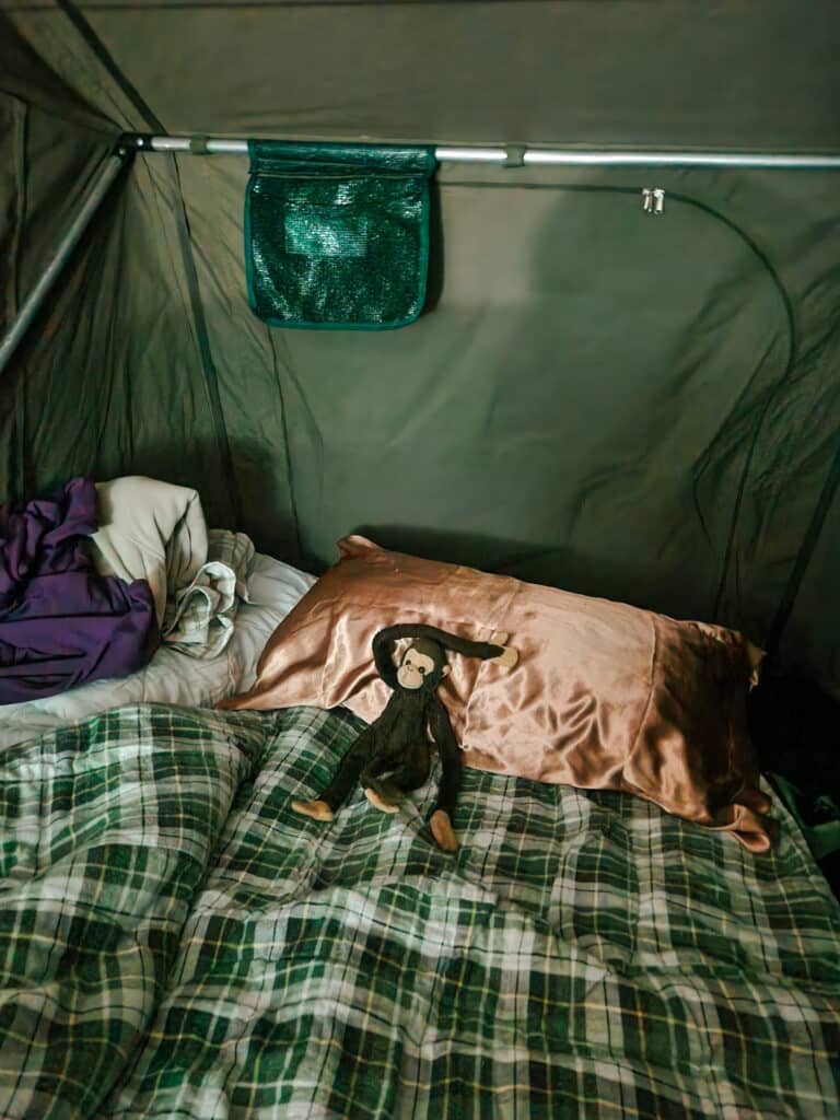 - Dachzelt mit Schlafsack und Kissen (übrigens: das Dachzelt ist sehr gemütlich und man kann auf allen Seiten die Fenster öffnen damit frische Luft aber Dank Fliegengitter keine kleinen Tiere ins Zelt kommen)